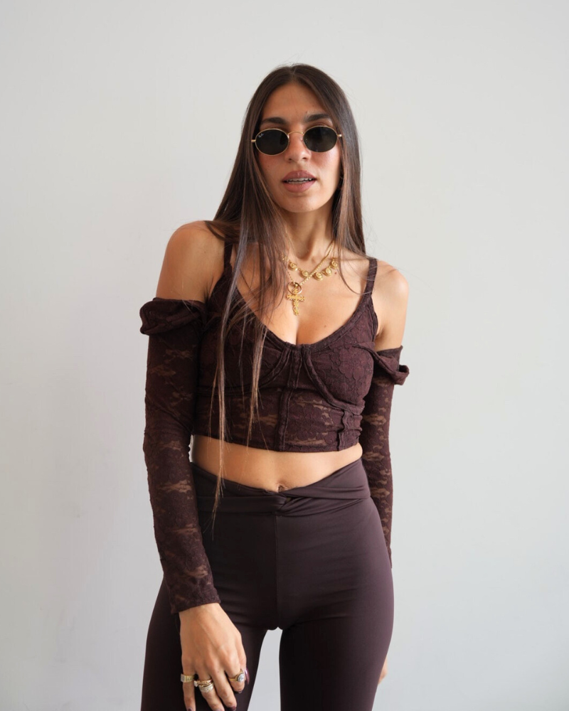 Turn heads in the Alessia Bustier, a chic brown lace top made for effortless night-out glamour.