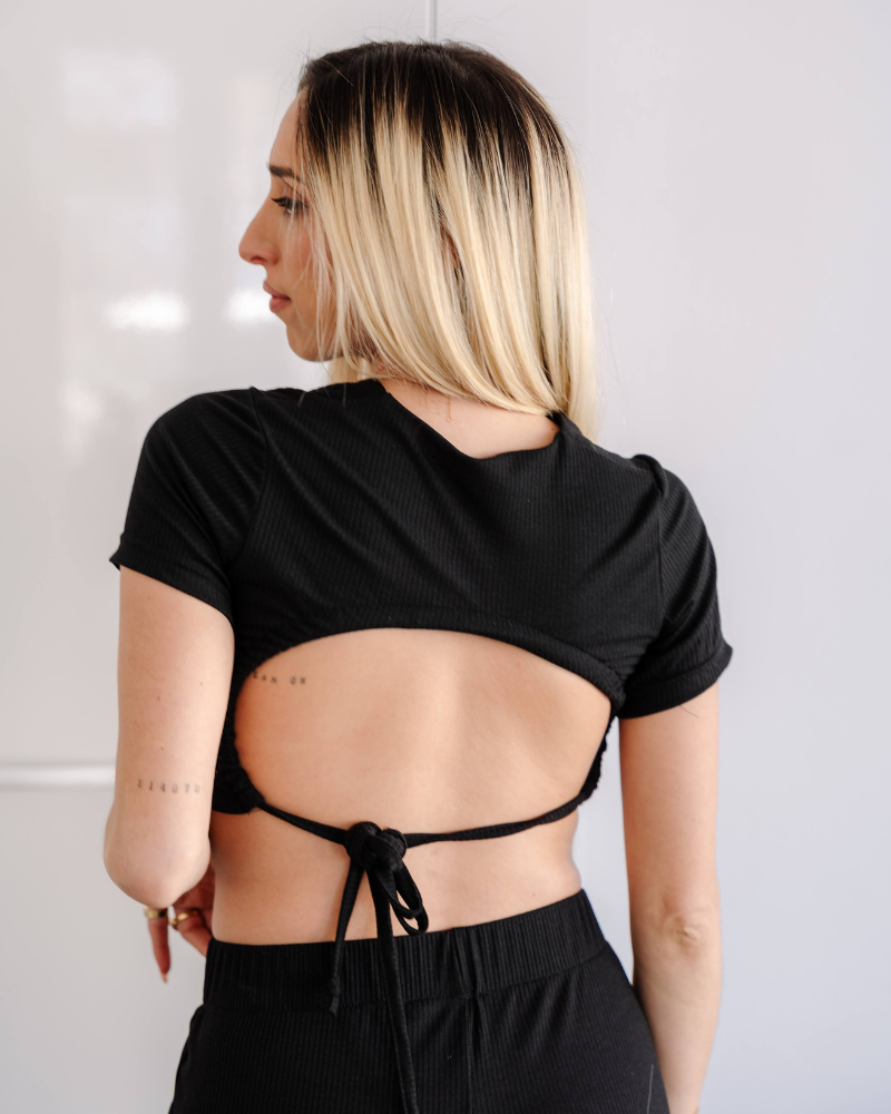 Stay cool and stylish with the Marina Rib Crop Top. Featuring a short sleeve design and an open back, this top offers the perfect mix of comfort and flair, available in black and white for effortless styling.